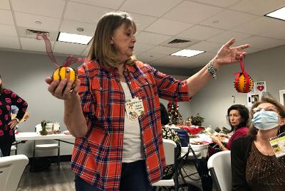 The Woodlands Garden Club members learned how to make a “pomander” at the November meeting. What’s a pomander you ask? From the French pomme d’ambre (apple of amber), it’s a ball or perforated container of sweet-smelling substances such as herbs and spices, placed in a closet, drawer, or room to perfume the air or (formerly) carried as a supposed protection against infection. Or, a piece of fruit, typically an orange or apple, studded with cloves and hung in a closet by a ribbon for a similar purpose.