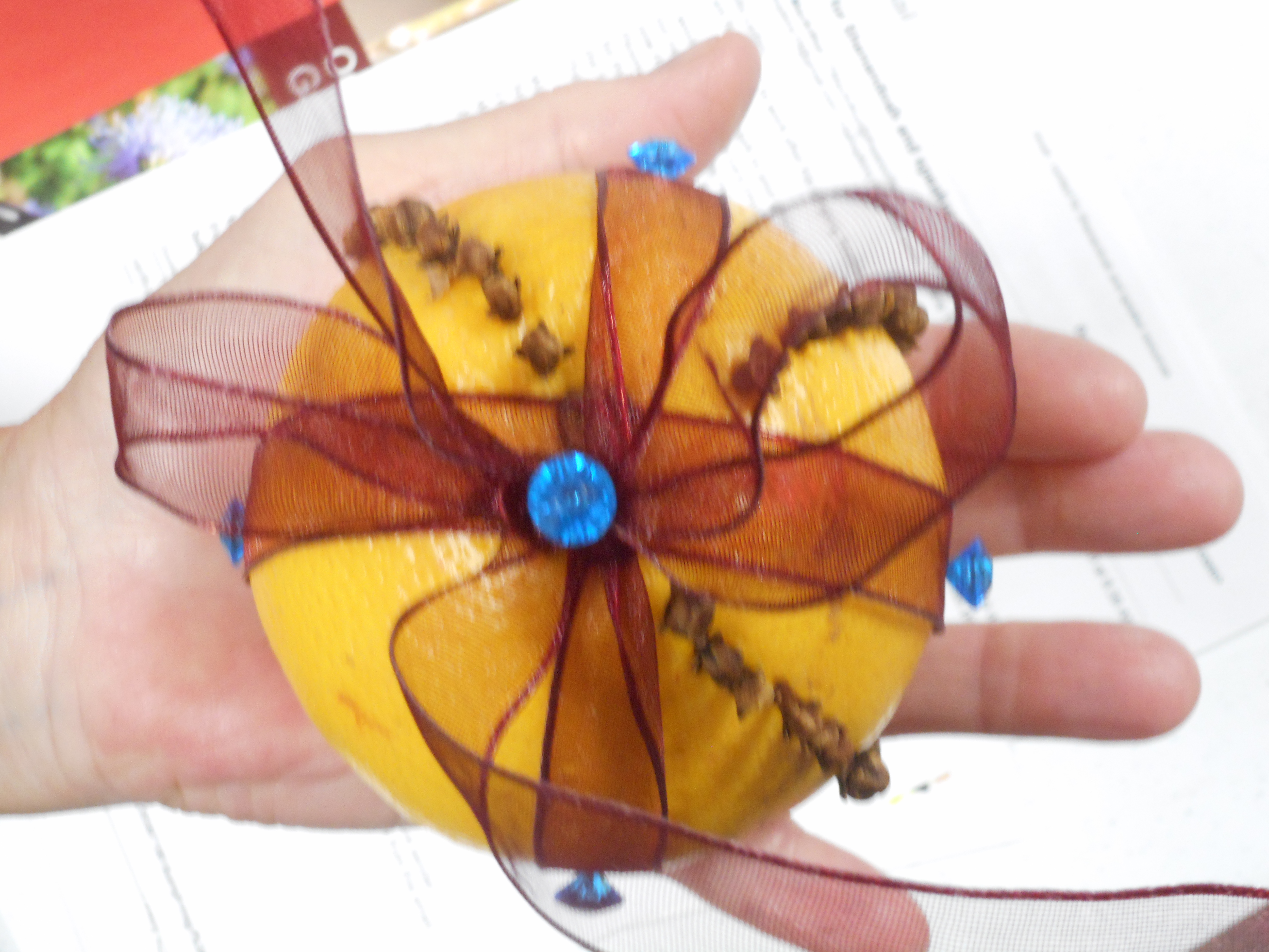 Fun holiday activity: cut a length of ribbon, set out a bowl with whole cloves, oranges and toothpicks, and listen to an audio book or festive music.