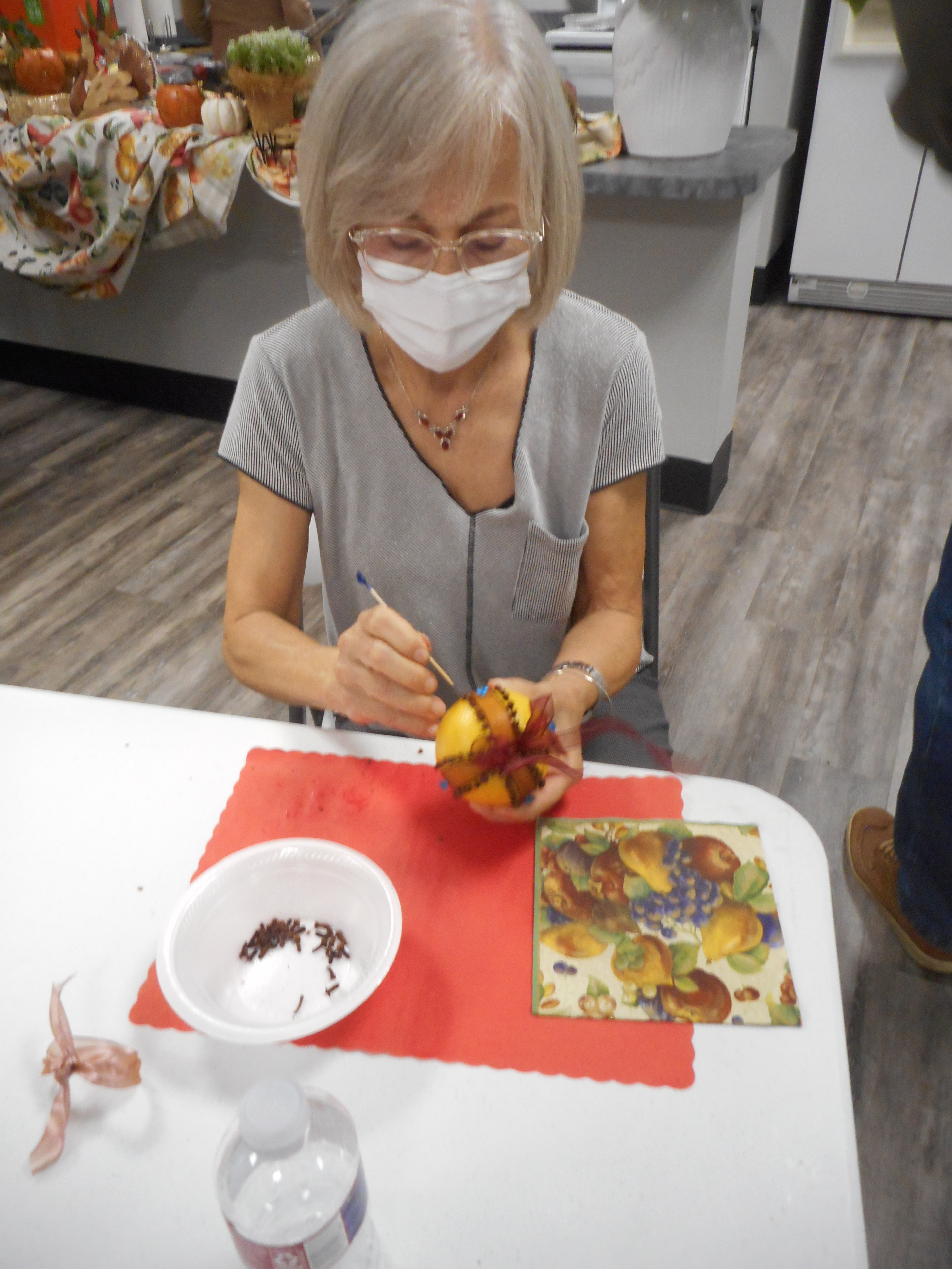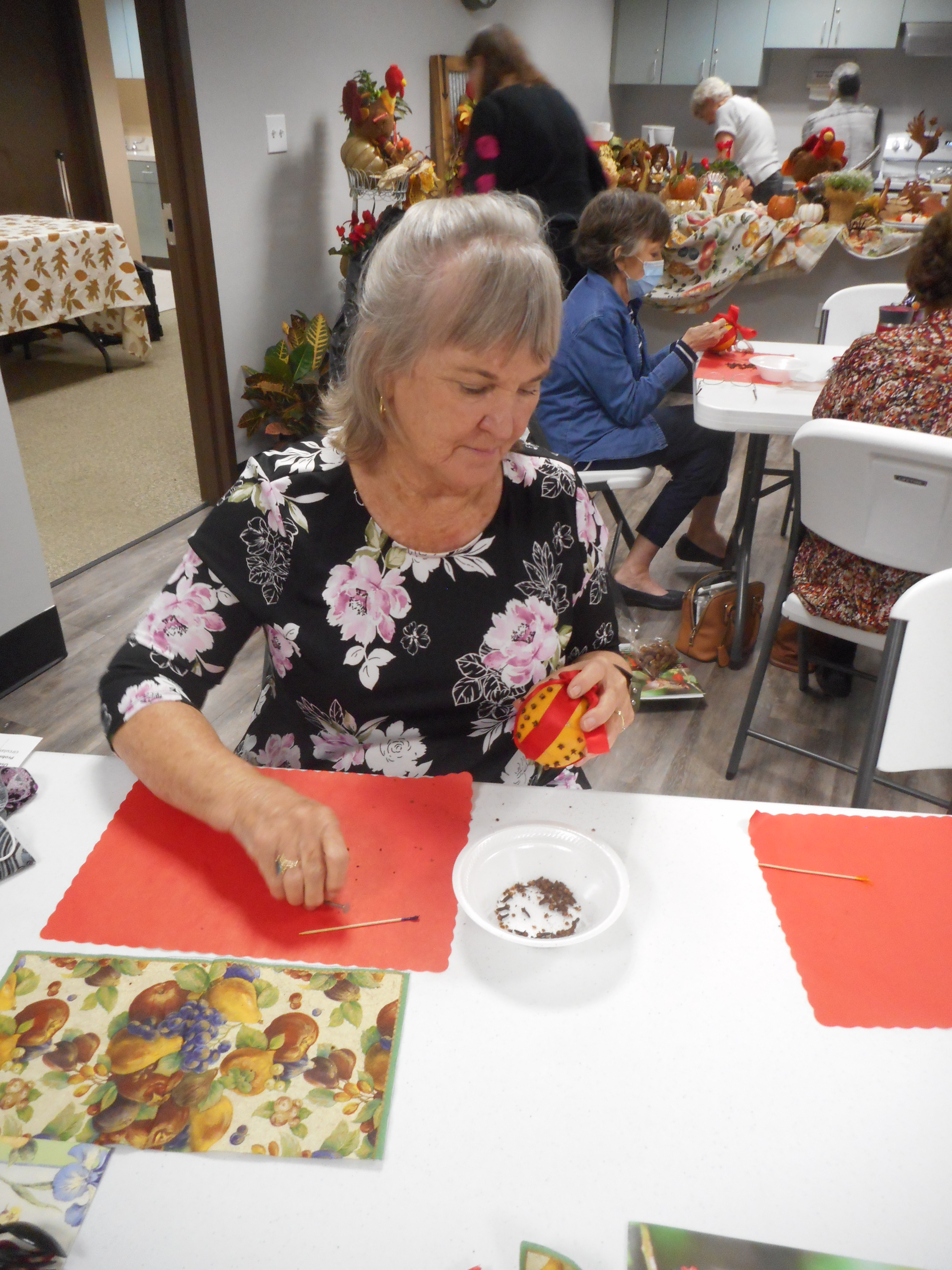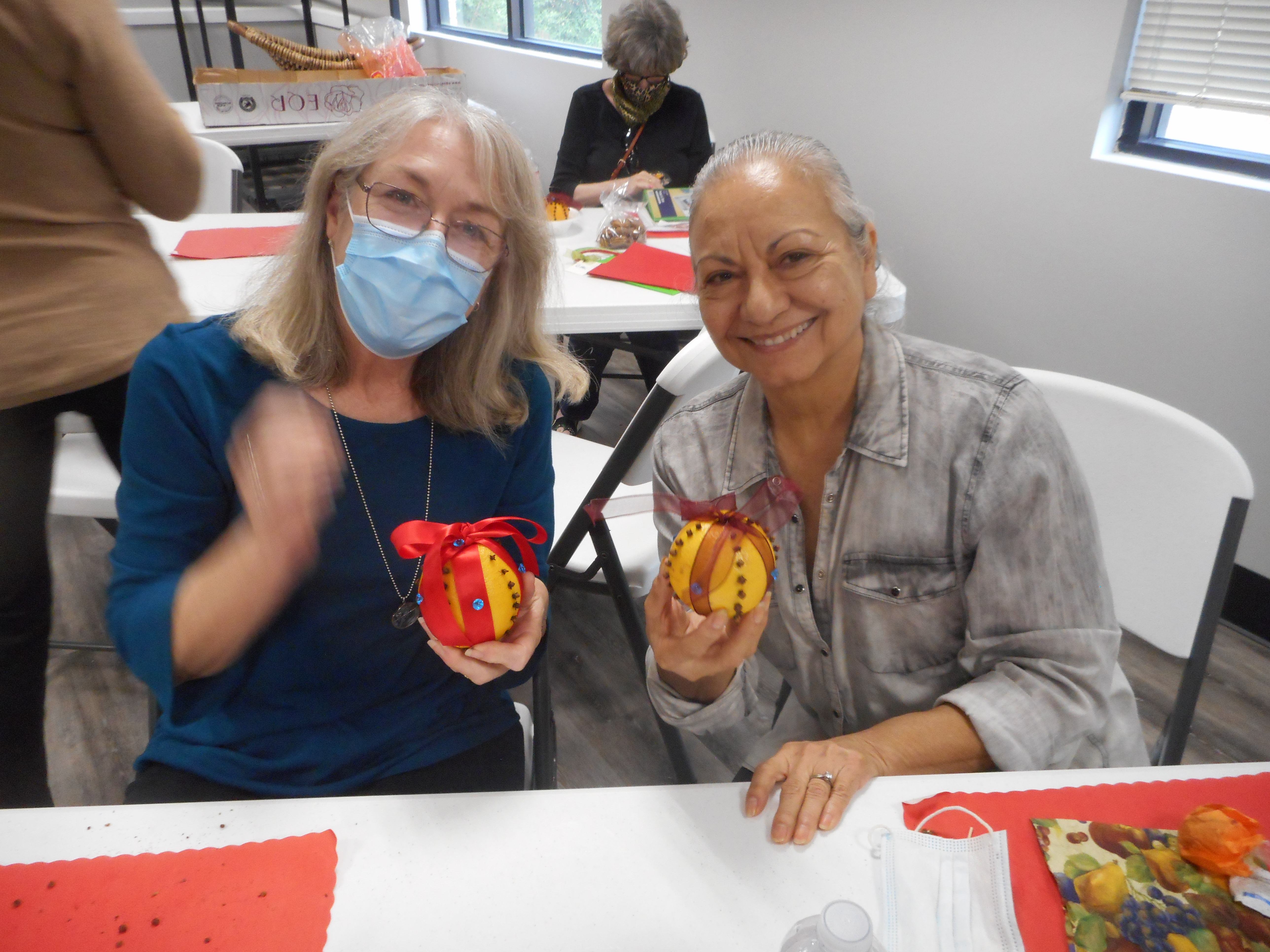 Pomander balls made with oranges and cloves have a great holiday scent and make festive and fragrant decorations for your dinner table and around the house. With Betty and Sharon instructing us, we did such a great job that employees from the offices nearby stopped in to check out that “wonderful smell.”