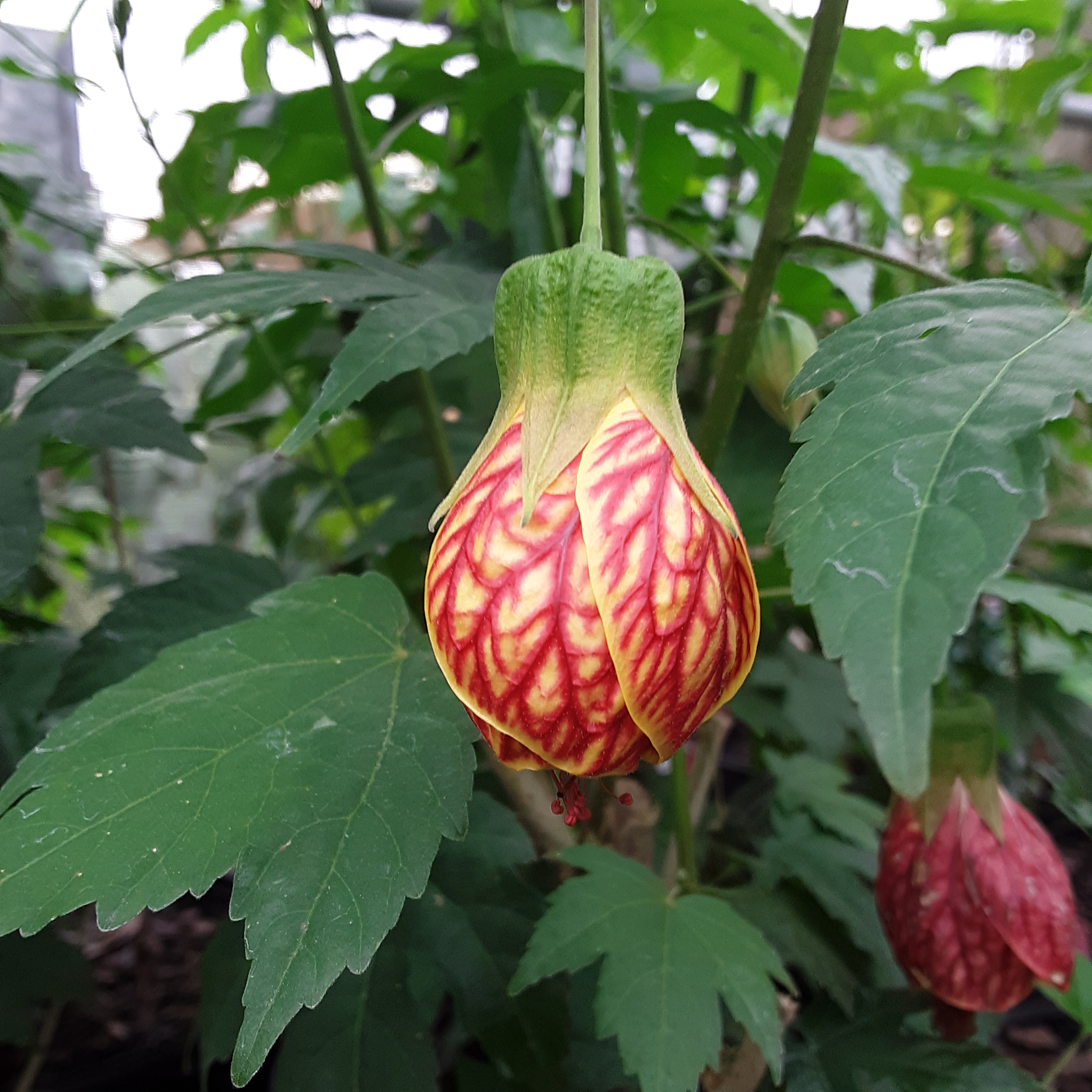 An heirloom variety from the famous Biltmore Estate in Ashville, NC, Abutilon Biltmore Ball Gown is incredibly striking with its dangling, tiger-striped blooms. Talk about a plant with style! It matures to about 4 feet tall and grows best in a bright shade to filtered light area. As long as it’s actively growing, it will continue to flower and it’s like a hardy Hibiscus, of which it is a close relative. Here in zone 9a Abutilon Biltmore Ball Gown will remain almost completely evergreen, unless we have a severe winter (oh boy!). It also makes an excellent houseplant if you can give it enough light.