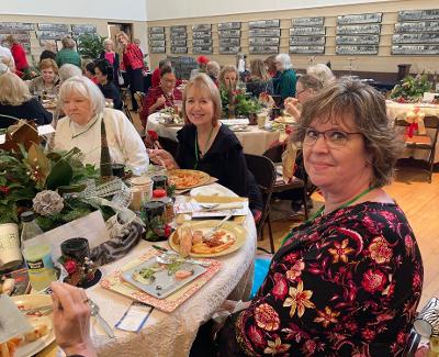On Thursday our volunteers decked the hall with boughs of holly, arranged the tables with stunning centerpieces and place settings, and put colorful bows on the chairs! Betty explained she designed the “top hat” party favors because TWGC is TOP HAT!