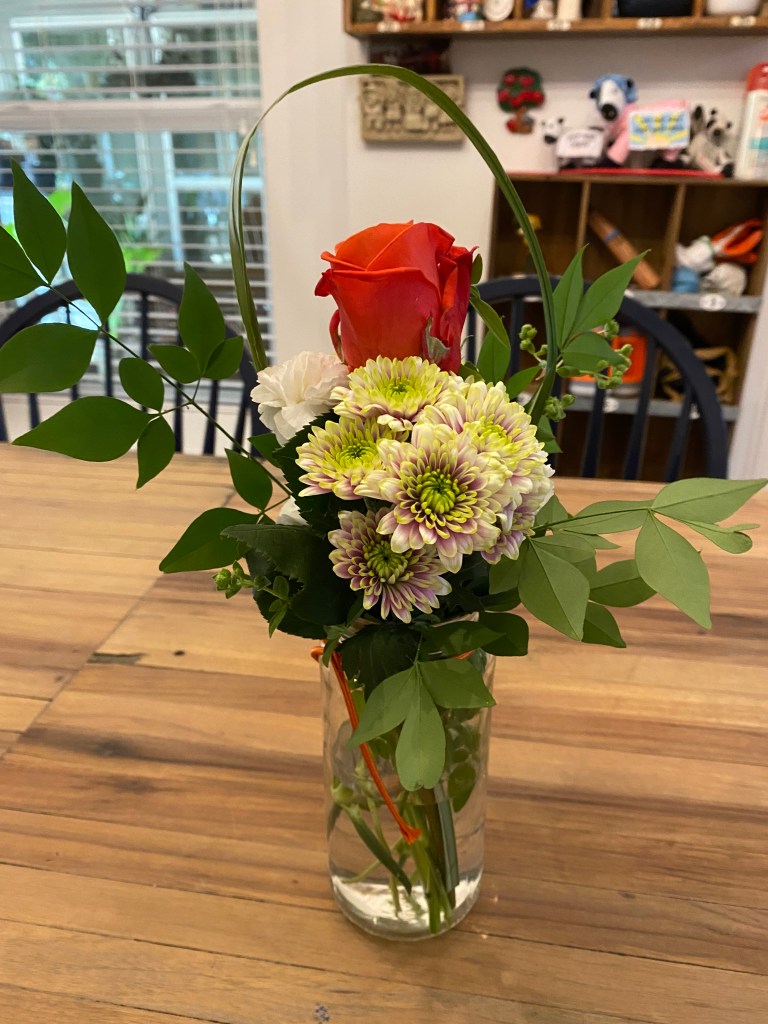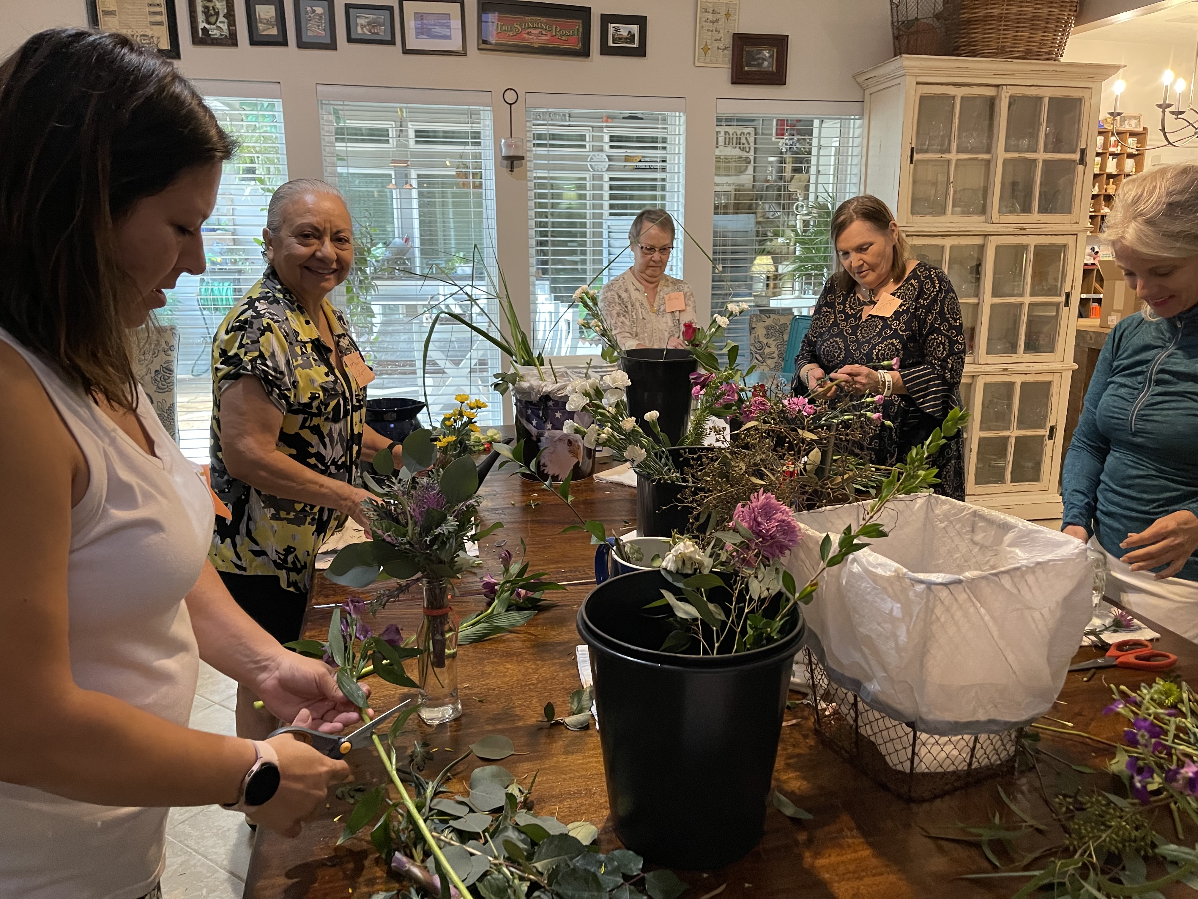 TWGC Floral Group meets once a month – September to May – to create small vases for hospice organizations in The Woodlands. We gather flowers and greens from our gardens, add purchased and donated items from local stores, and finish it off with a pretty bow!