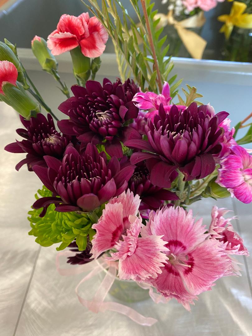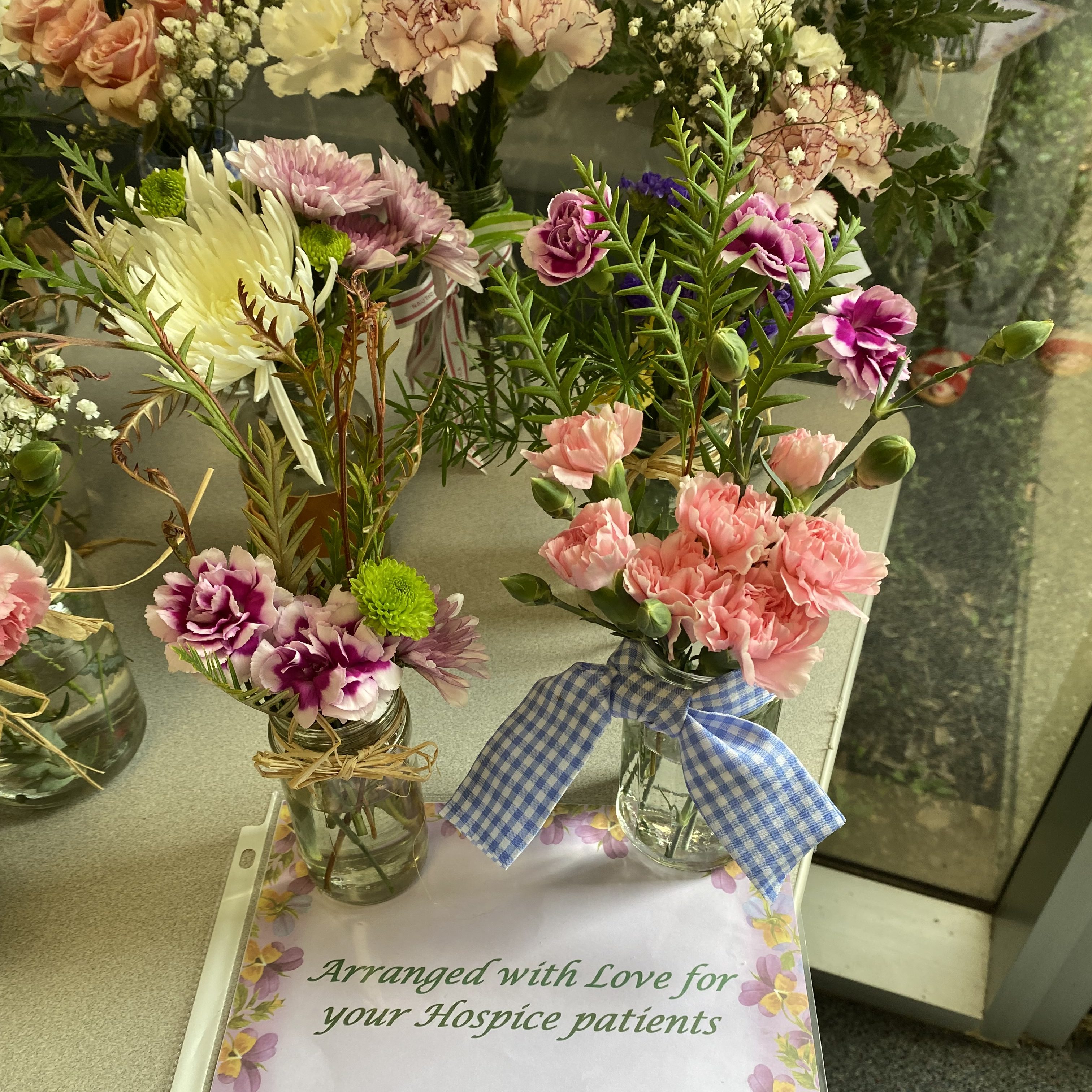 The flower arrangements are little pieces of nature brought indoors – a gift that brings beauty, peace and tranquility, and an unmistakable feeling of love and caring. The vases are delivered to the hospice agencies and the nurses take them to their patients. Empty containers are collected from the hospices, cleaned and reused. We also ask our members to bring small jars to the general meetings and the Floral Group.