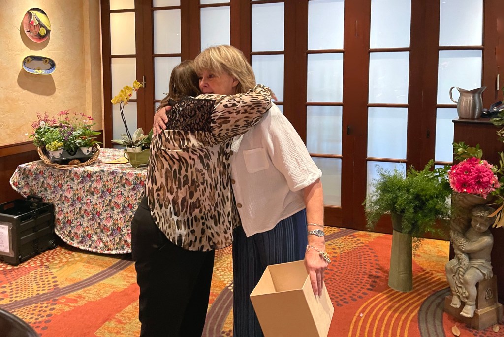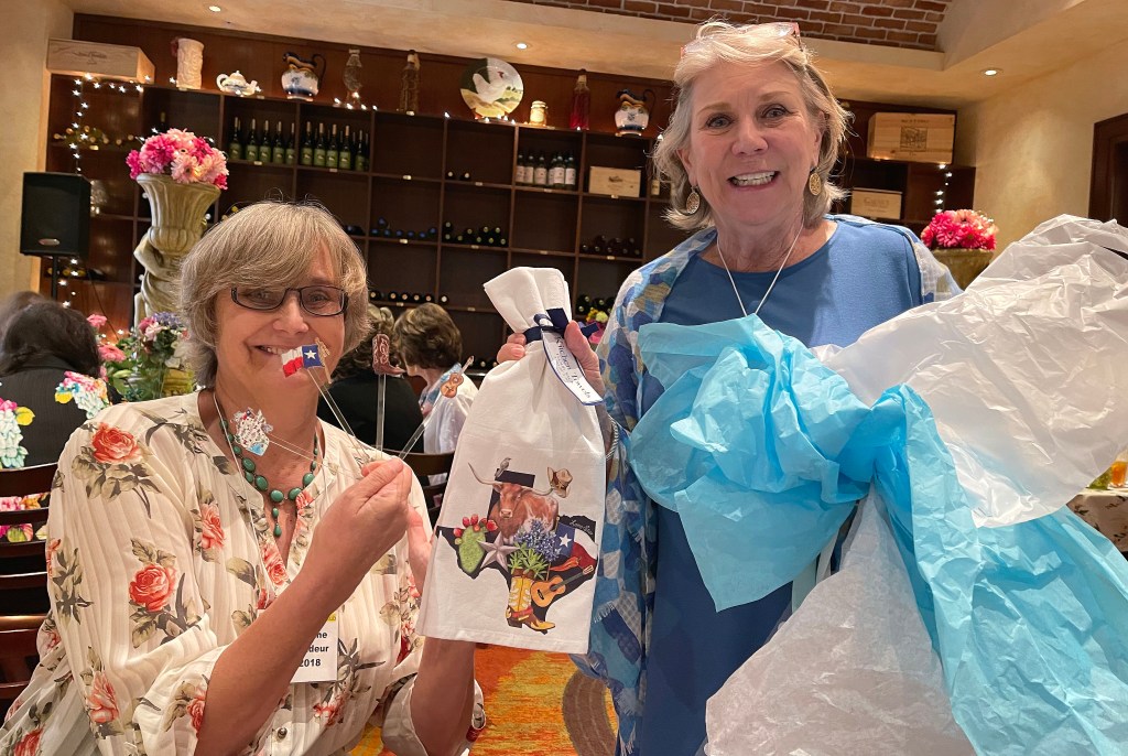 Emotional outgoing President Betty Lahiri received a plaque to be installed on a bench in Shenandoah, and incoming President Bitsey Crismon revealed embroidered t-shirts and tote bags.