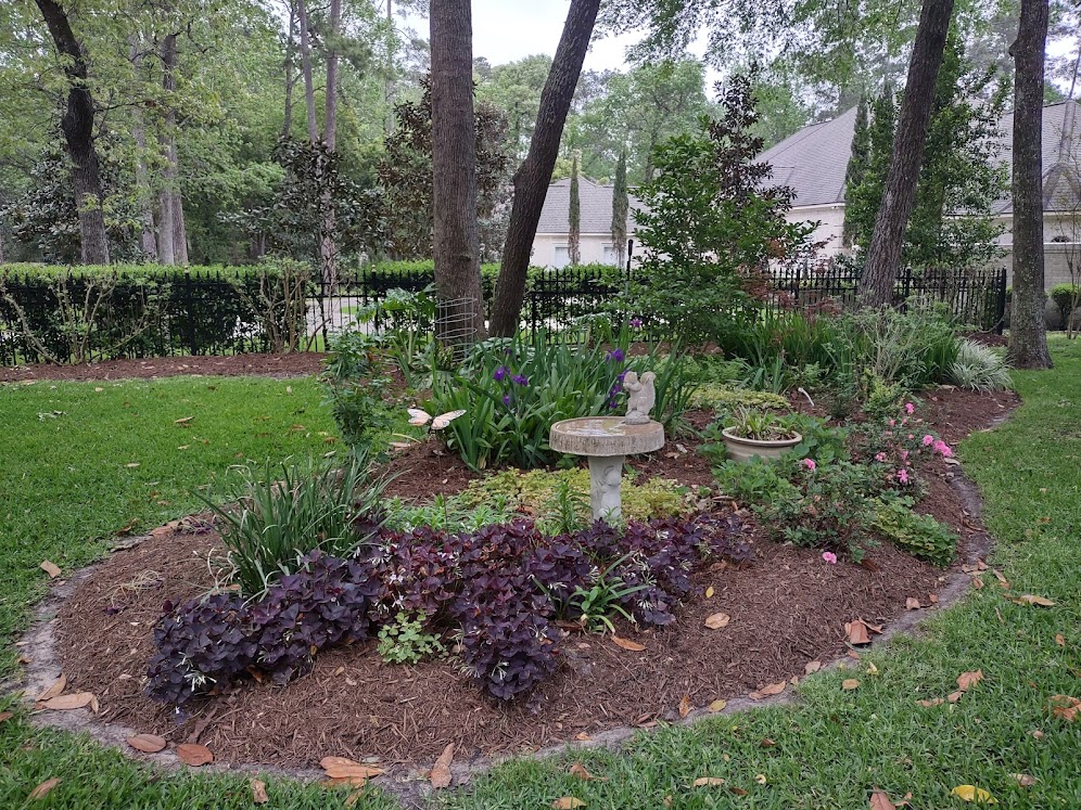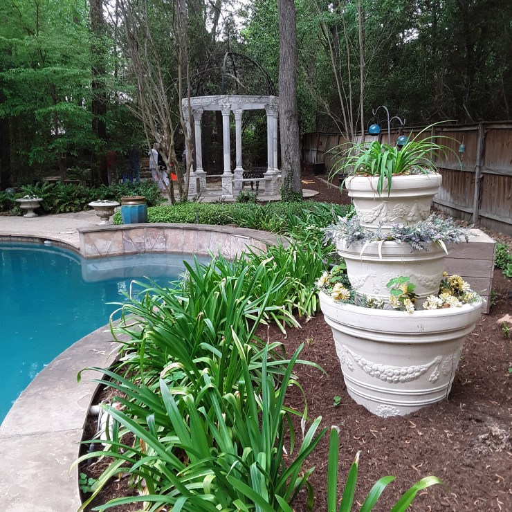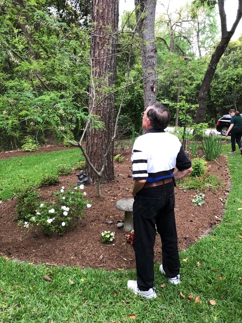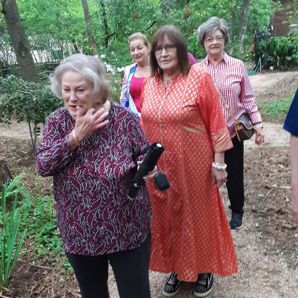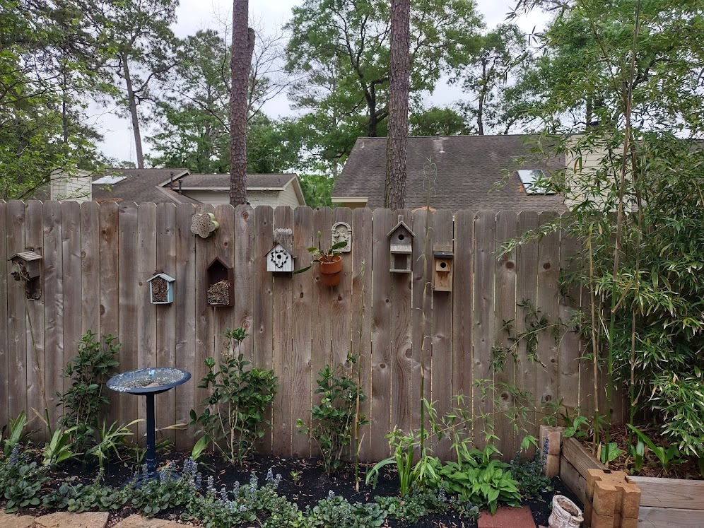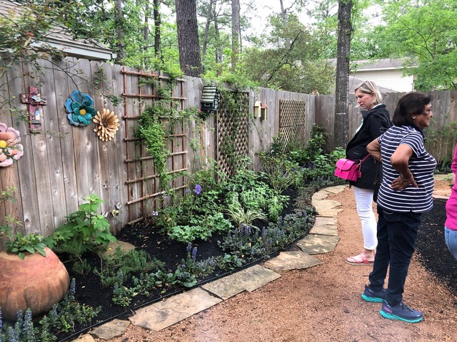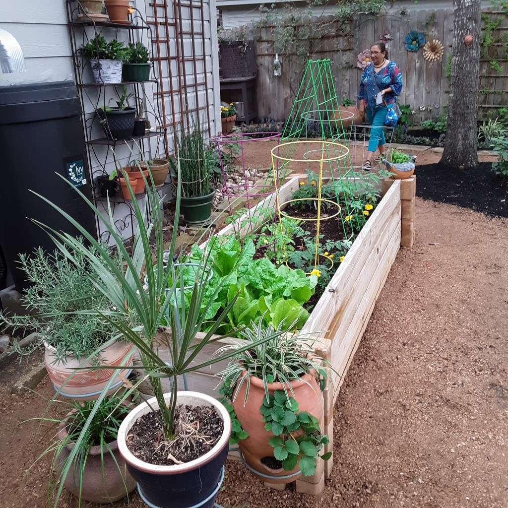 We continued to Jarka Smekalova’s garden in Grogan’s Forest. Her home is at the end of a cul-de-sac overlooking the greenbelt. The focal point of the front yard is the majestic palm tree surrounded by flowers in a raised bed. Jarka lost the jasmine covering the back yard fence during the February freezes and has replaced it with the most “real” looking greenery panels.