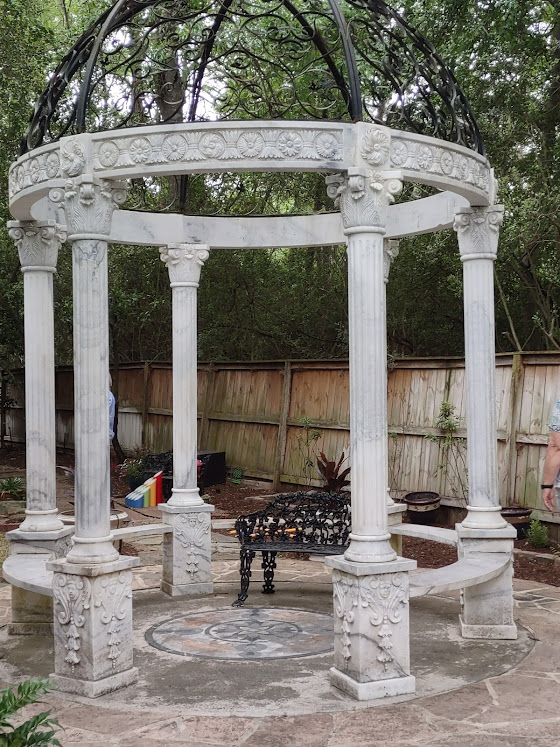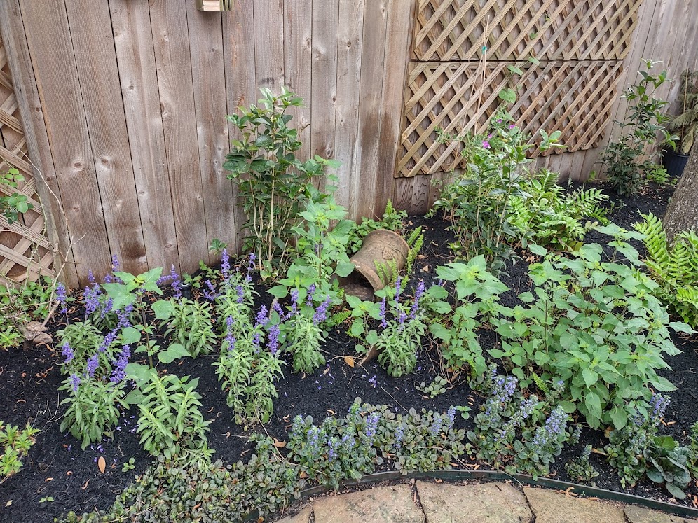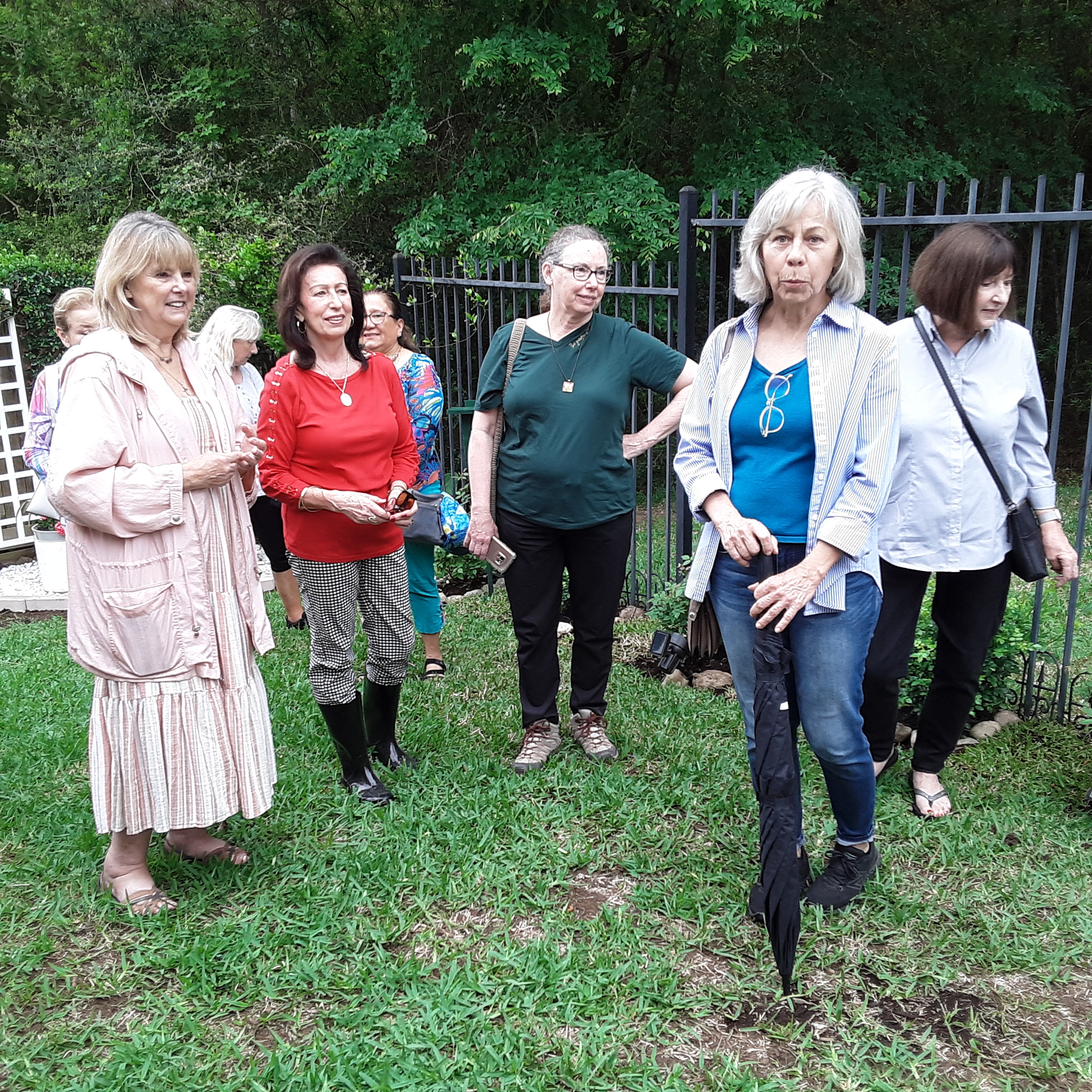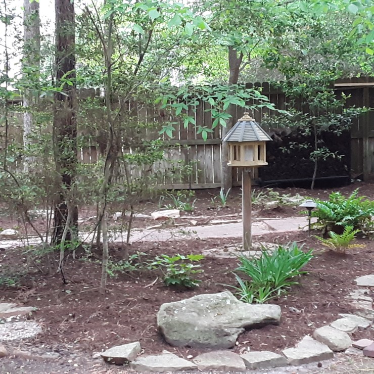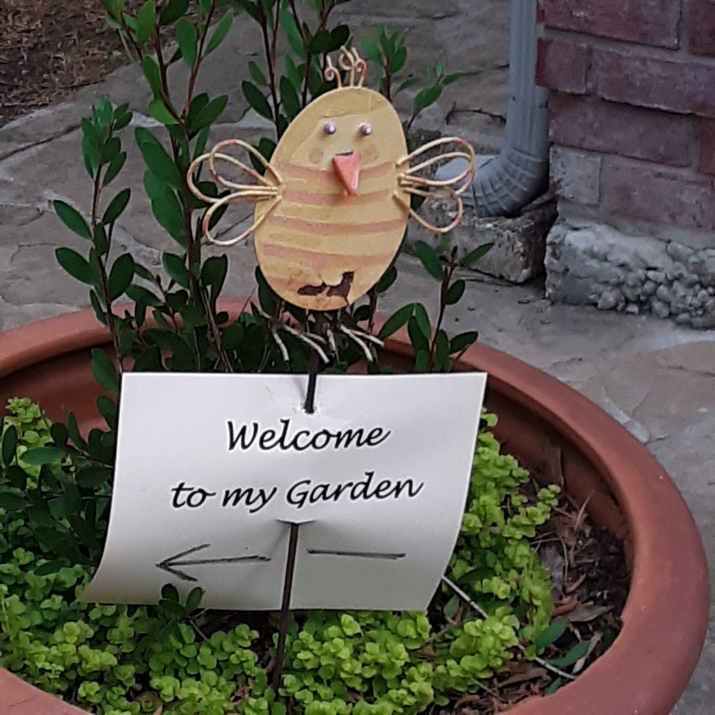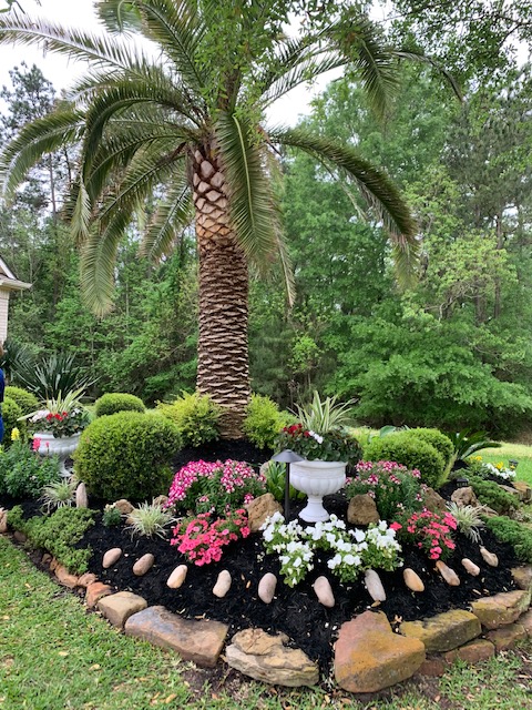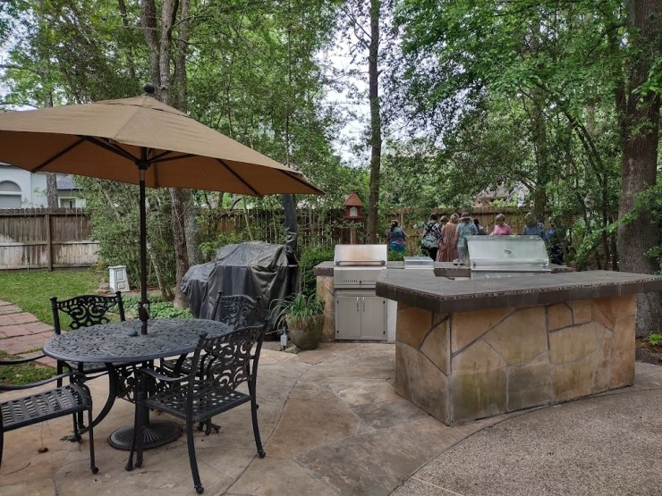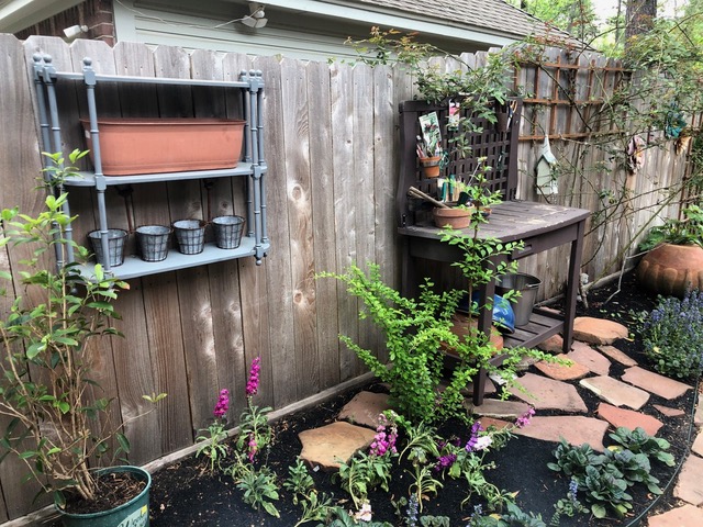 We continued to Jarka Smekalova’s garden in Grogan’s Forest. Her home is at the end of a cul-de-sac overlooking the greenbelt. The focal point of the front yard is the majestic palm tree surrounded by flowers in a raised bed. Jarka lost the jasmine covering the back yard fence during the February freezes and has replaced it with the most “real” looking greenery panels.