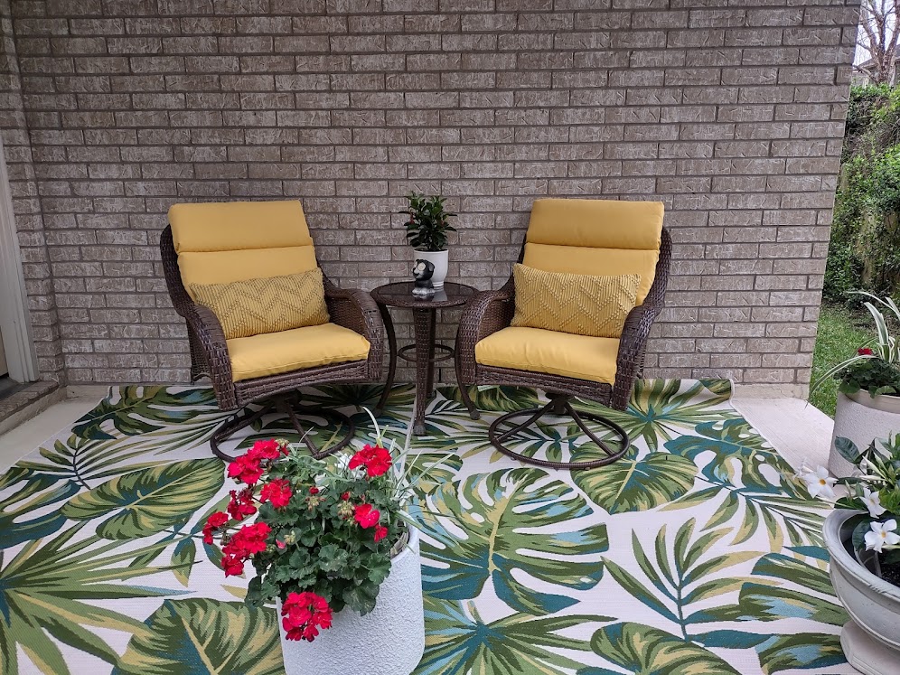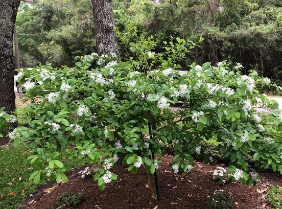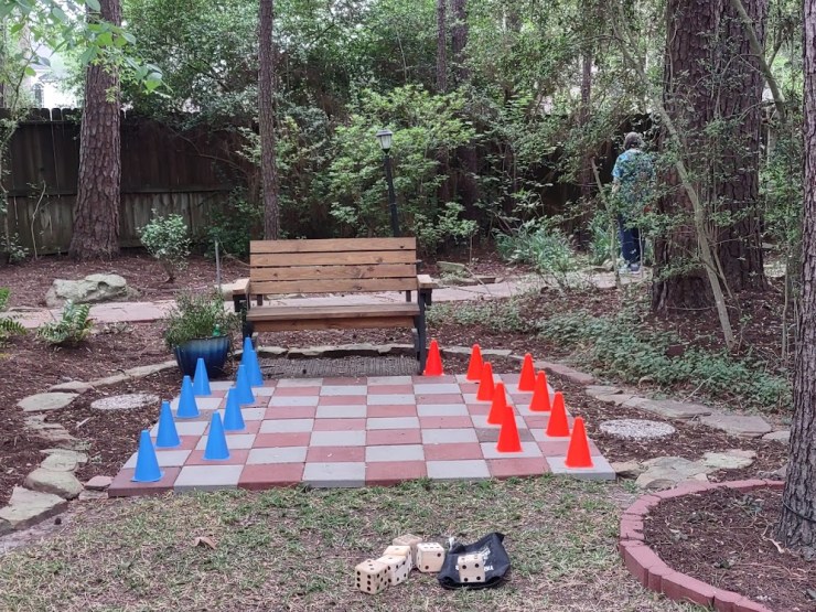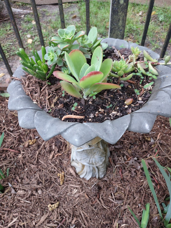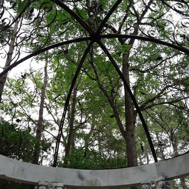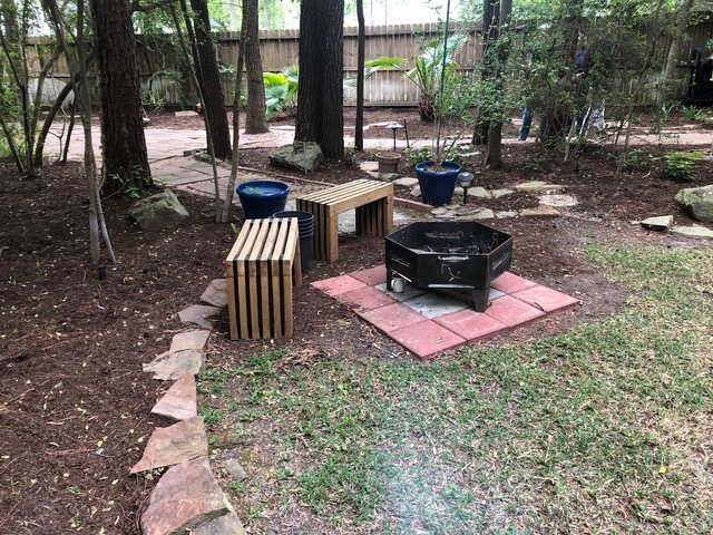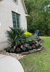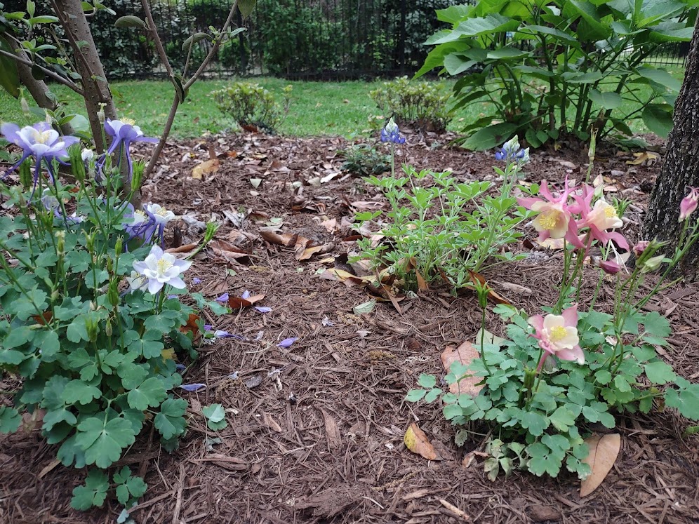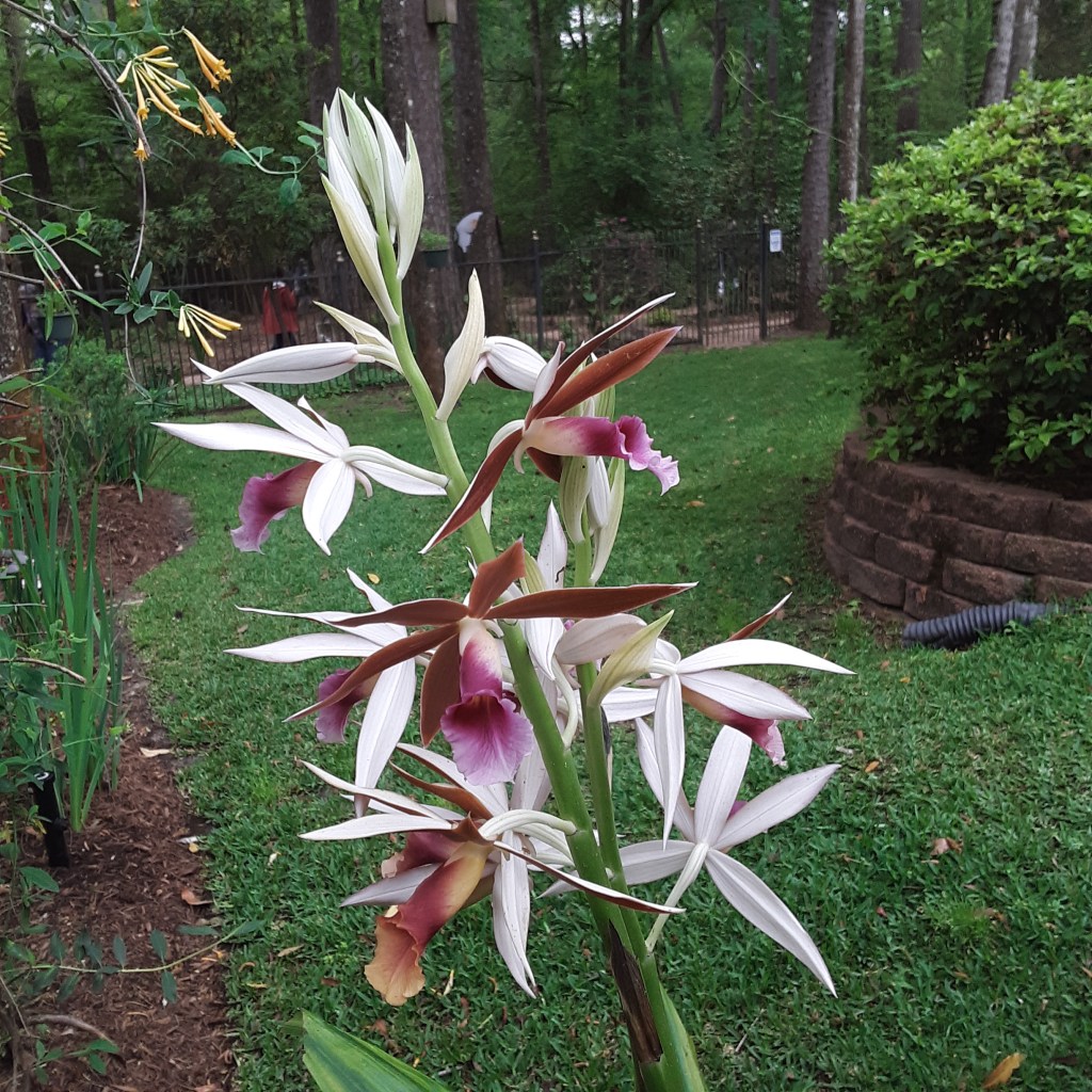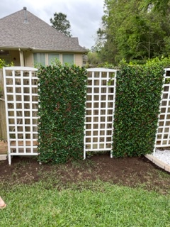 We continued to Jarka Smekalova’s garden in Grogan’s Forest. Her home is at the end of a cul-de-sac overlooking the greenbelt. The focal point of the front yard is the majestic palm tree surrounded by flowers in a raised bed. Jarka lost the jasmine covering the back yard fence during the February freezes and has replaced it with the most “real” looking greenery panels.