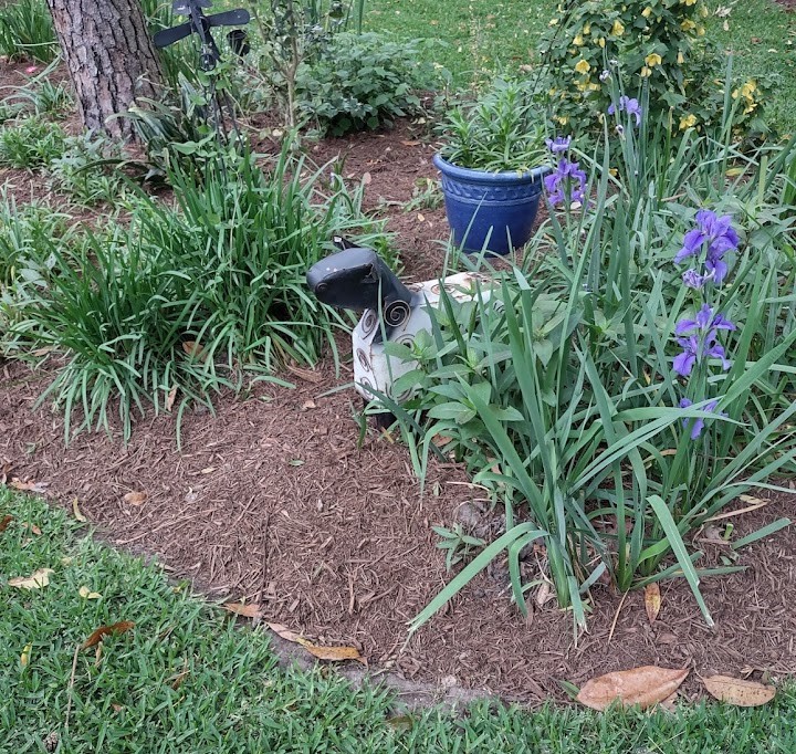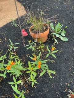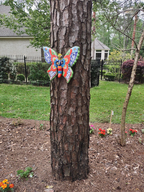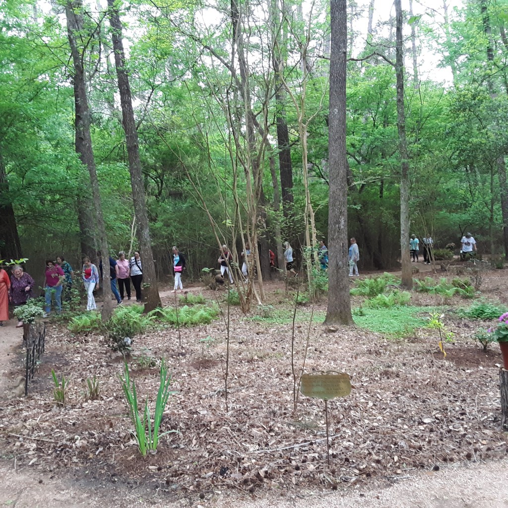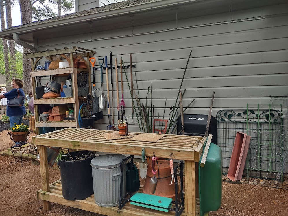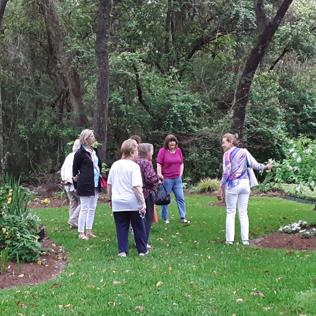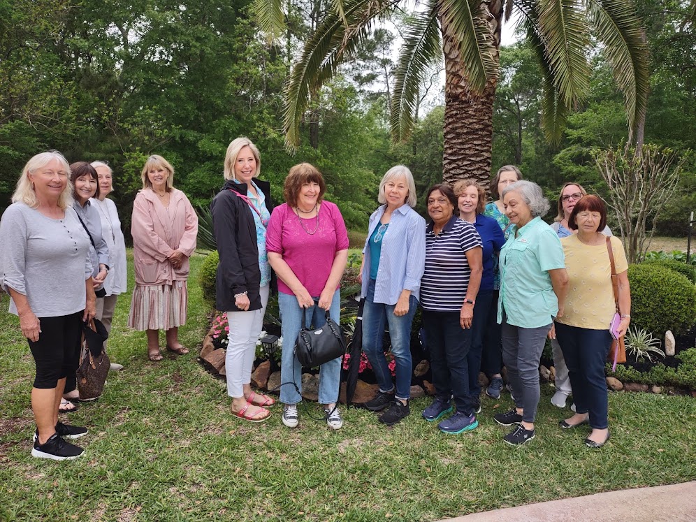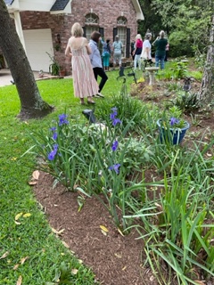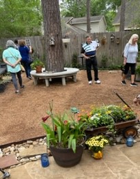 Next we went to Bitsey Crismon’s in Cochran Crossing where we recognized the beautiful gazebo from the 2021-22 member directory. The challenge in Bitsey’s garden is too much shade. We liked the children’s play areas, garden art, and handmade wooden benches. Bitsey is planning a workshop during the summer to teach us how to make the pot cluster.