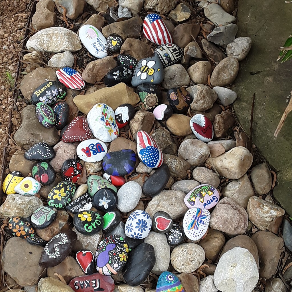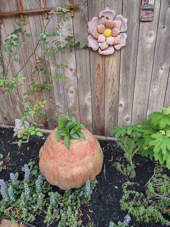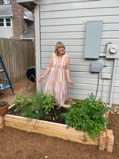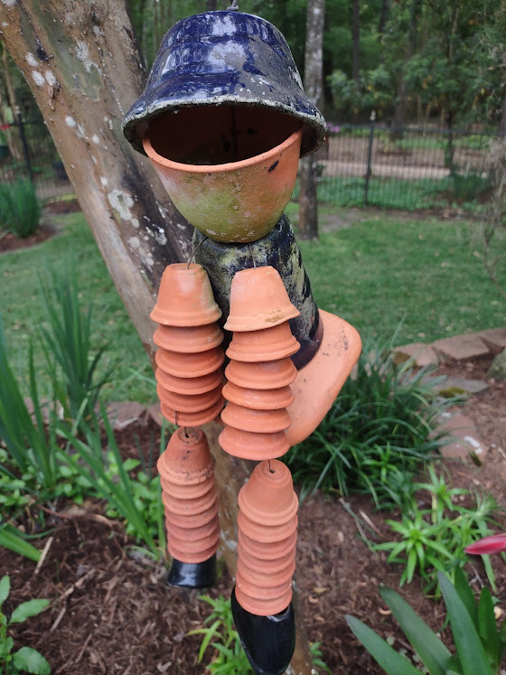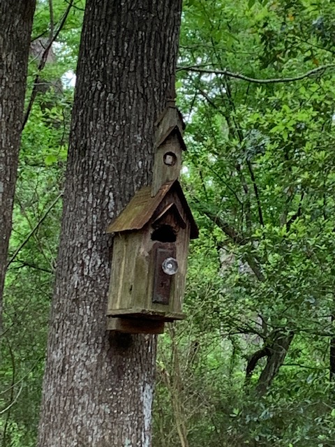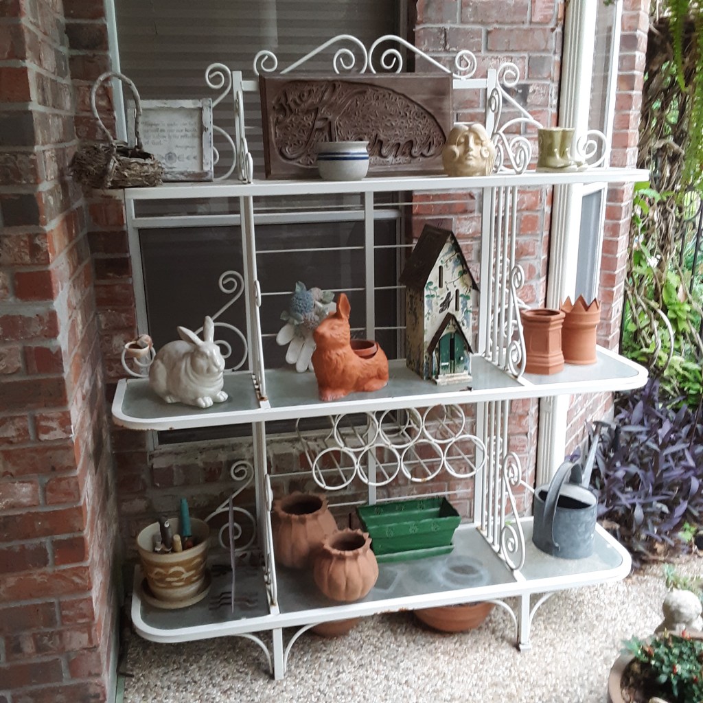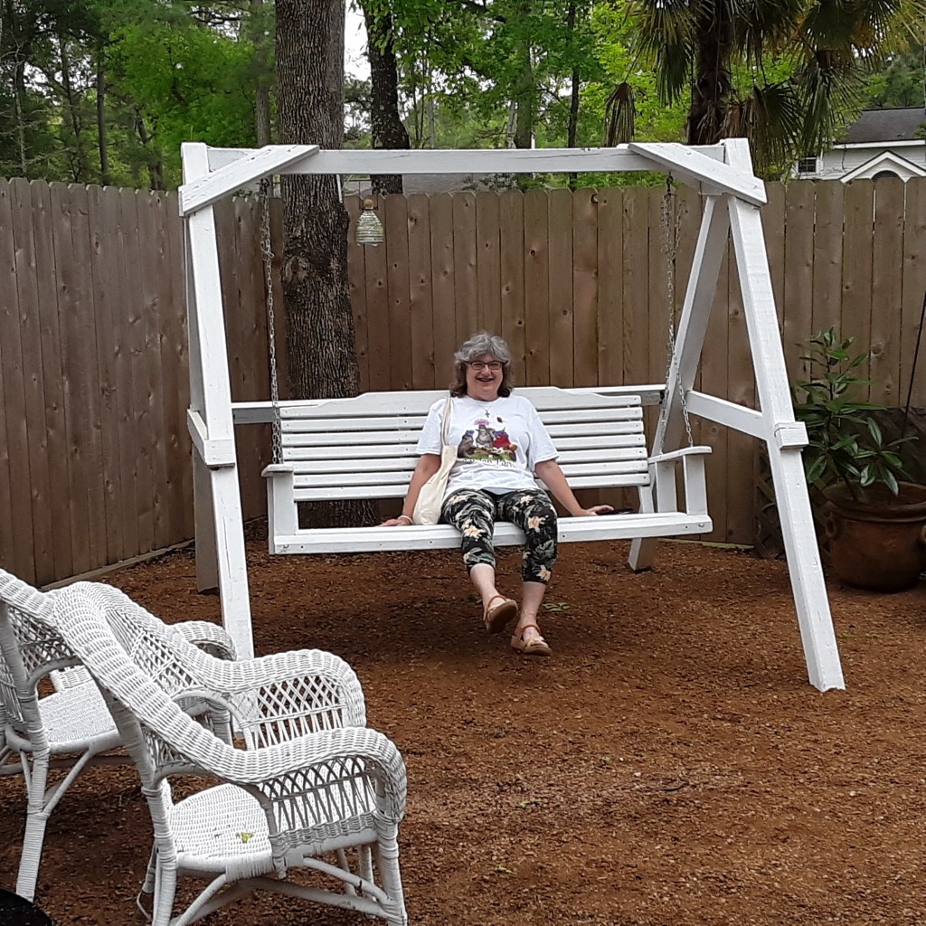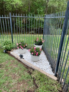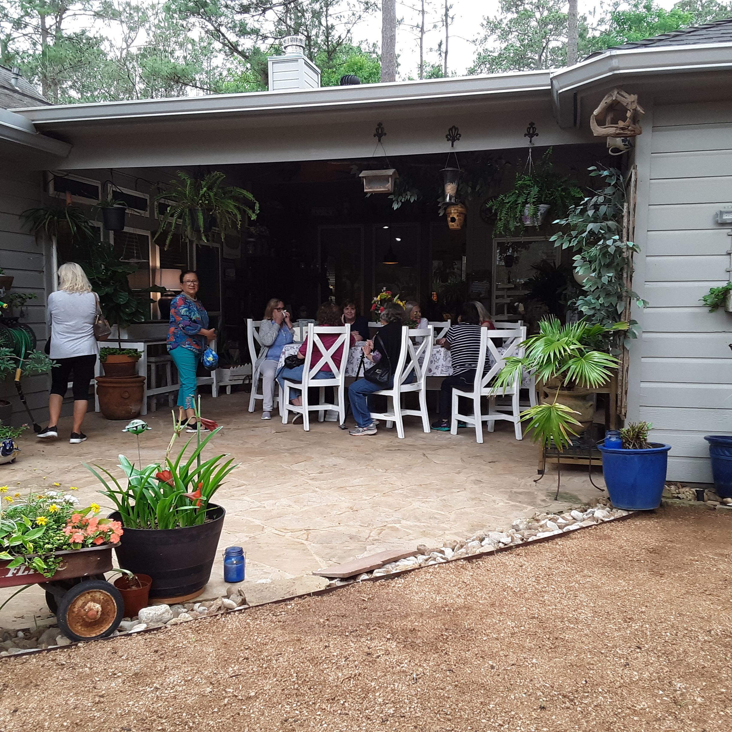 Next we went to Bitsey Crismon’s in Cochran Crossing where we recognized the beautiful gazebo from the 2021-22 member directory. The challenge in Bitsey’s garden is too much shade. We liked the children’s play areas, garden art, and handmade wooden benches. Bitsey is planning a workshop during the summer to teach us how to make the pot cluster.