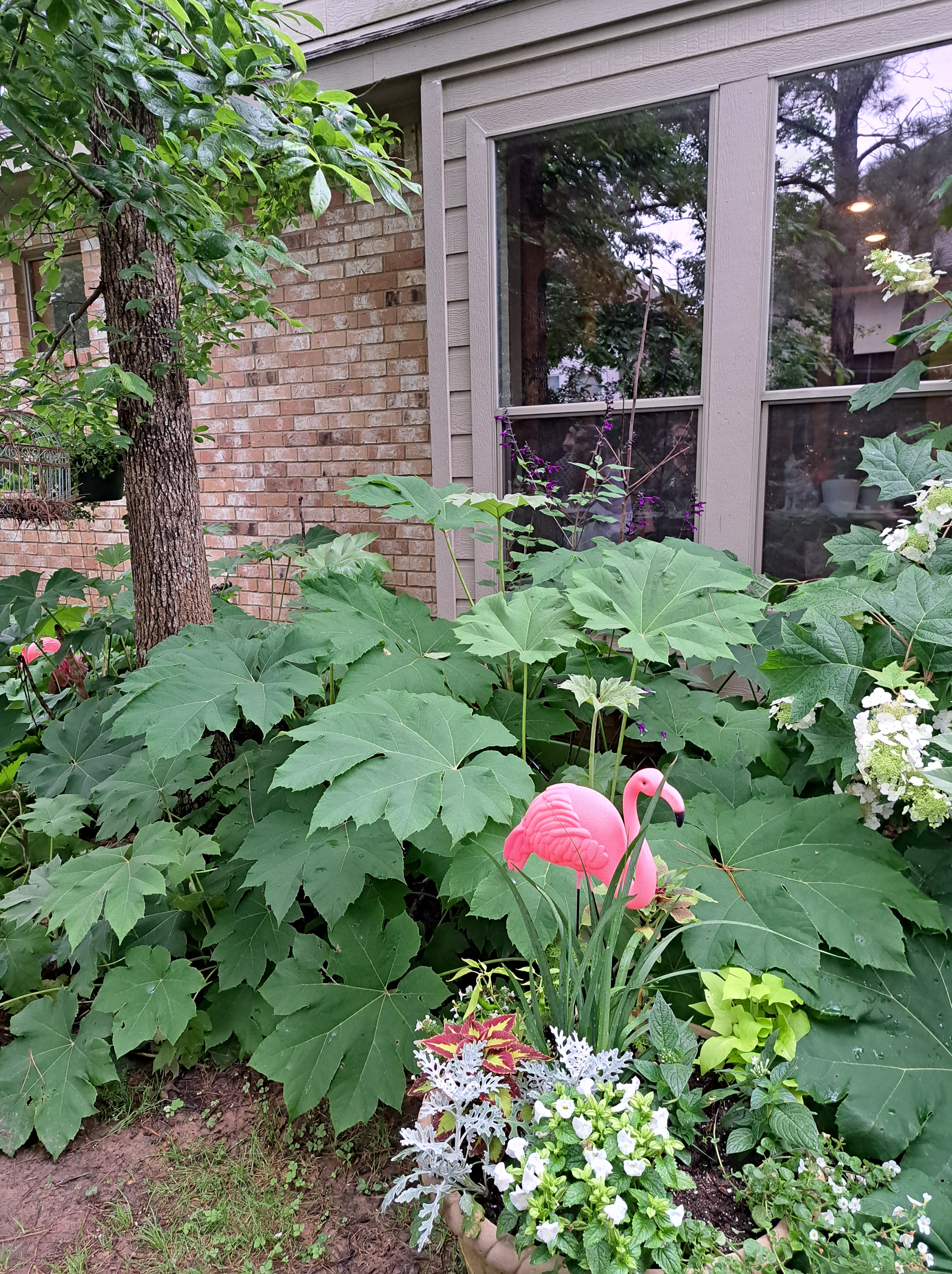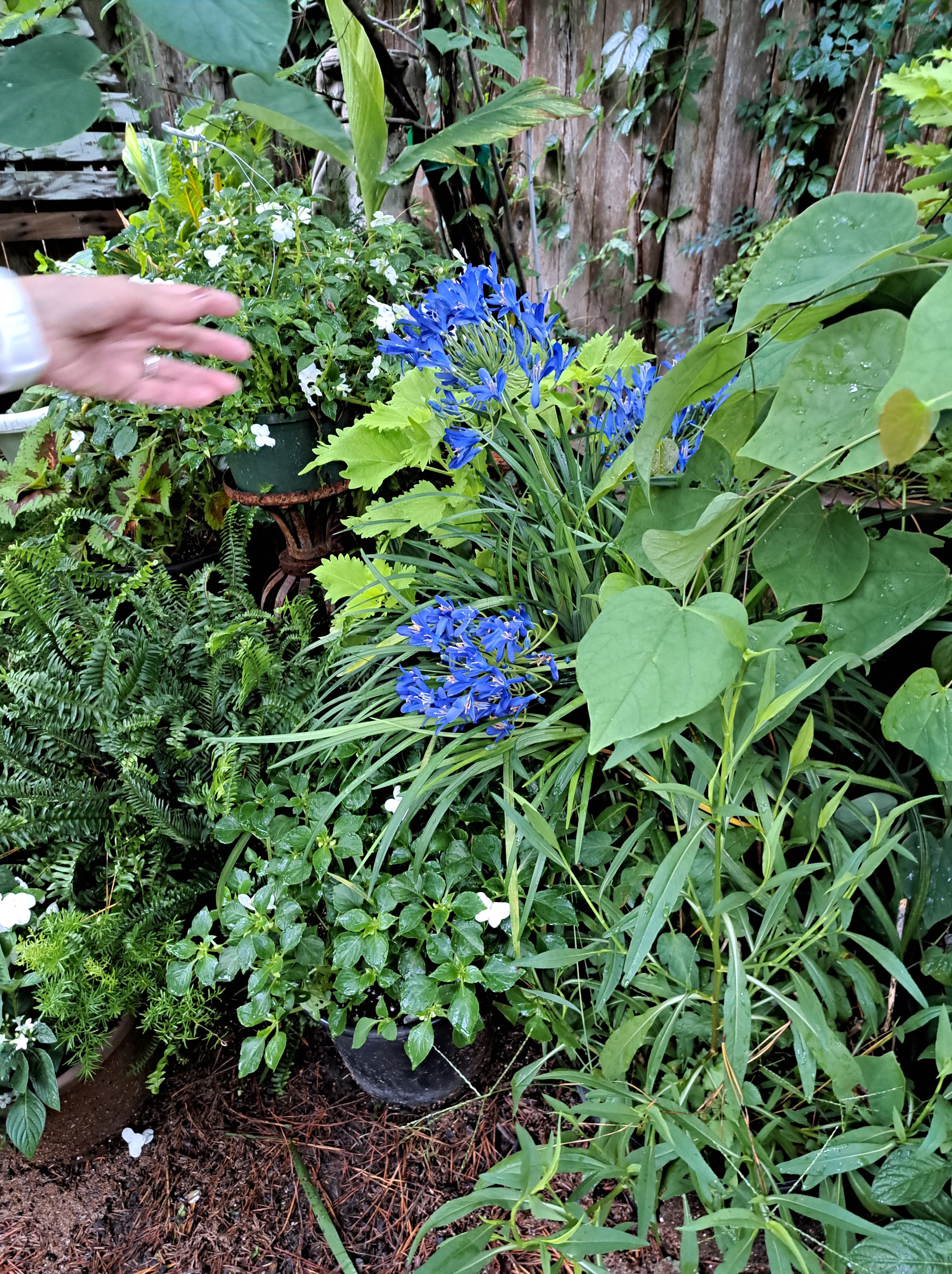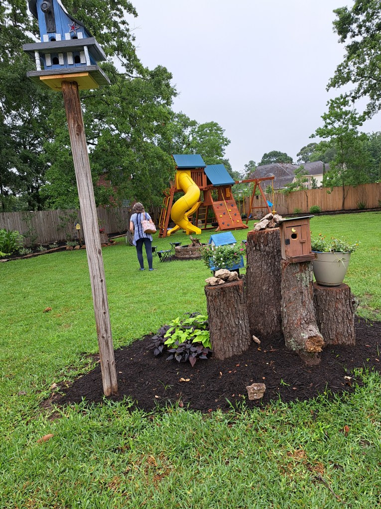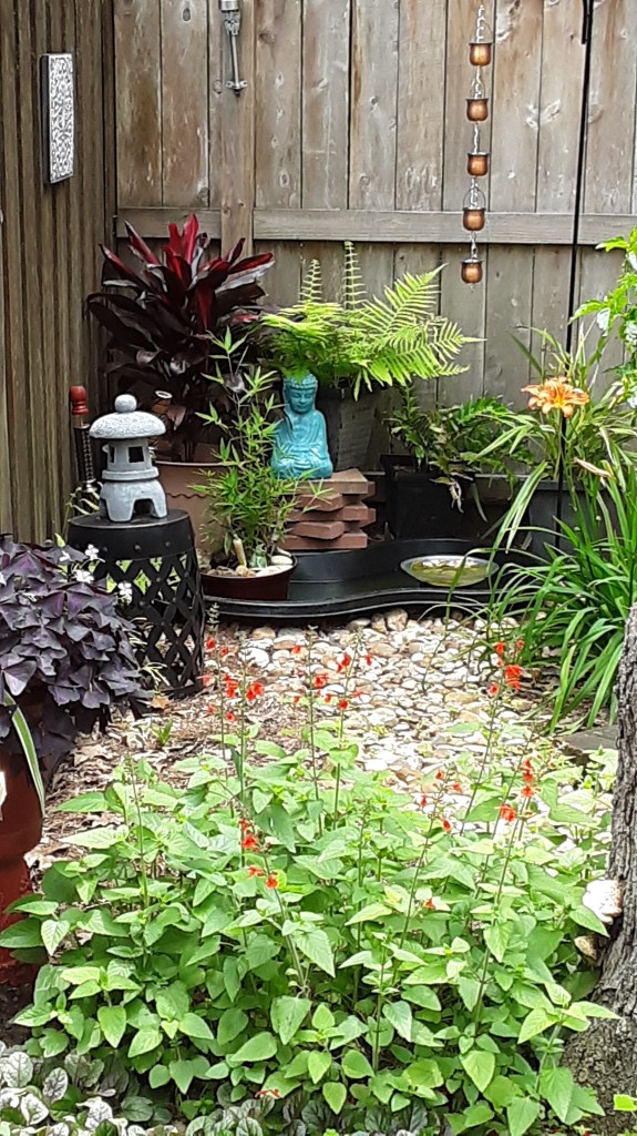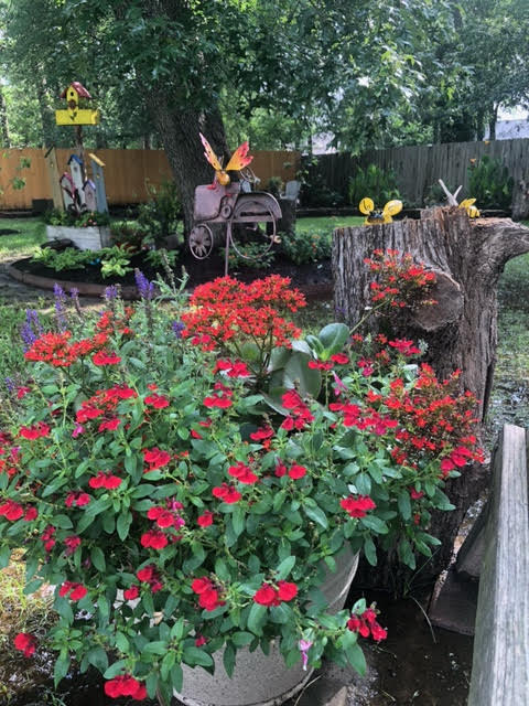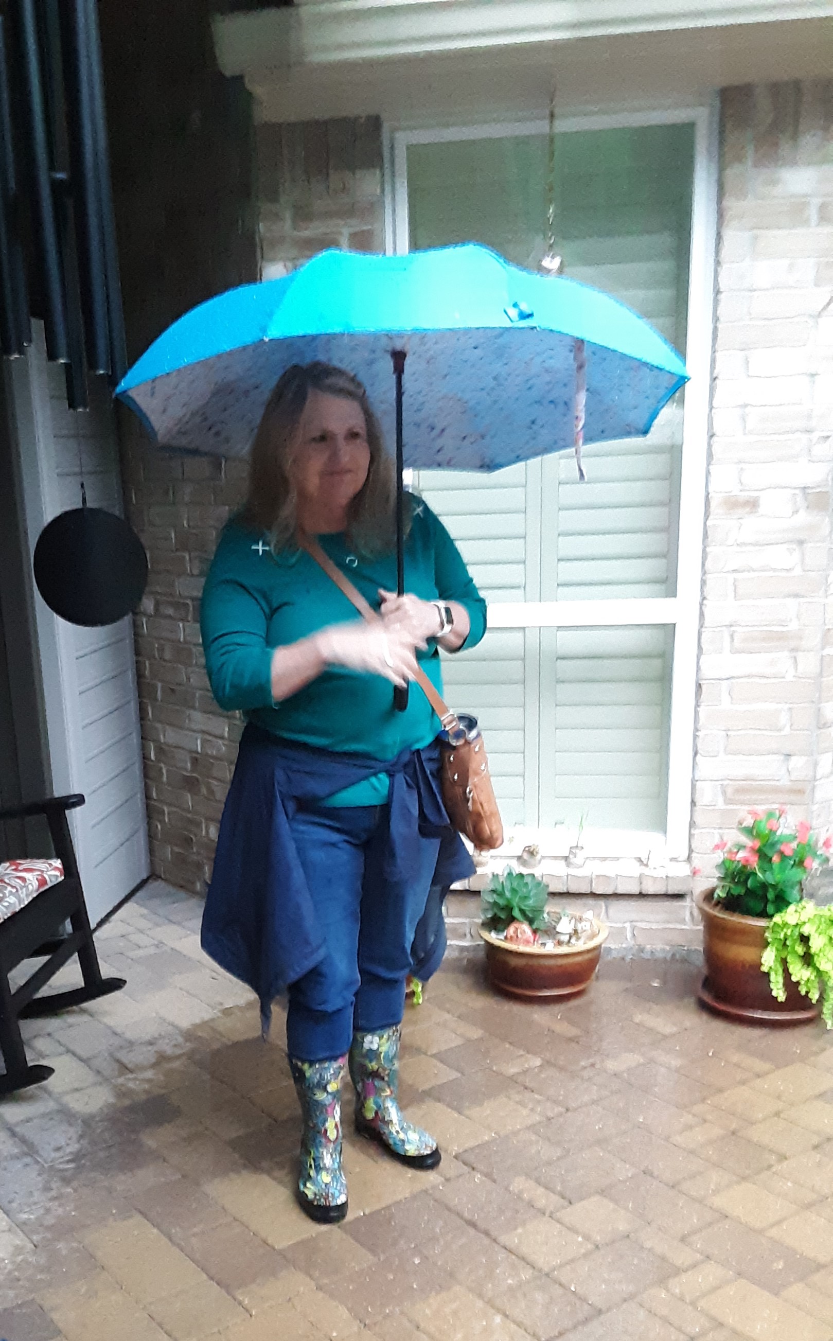 Did you hear that thunder rumble? On our way to Donna’s the downpour started… We admired the beautiful backyard from the shelter of the covered patio and Donna kindly provided pictures after the storm.