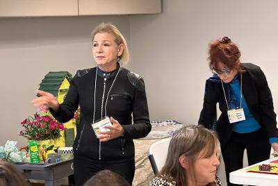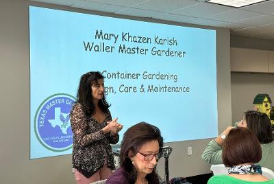 “With quality potting soil, the proper container, and the right location, you can grow just about anything in a container garden,” says Mary Khazen Karish, a Master Gardener. She gave an informative program on the basics of container plant care and maintenance. In the second part of the program Floral Designer Betty Lahiri displayed several combinations and containers. Click on the link to see a special feature in The Woodlander with Betty Lahiri, Sharon Podolski, and Mary Barnes demonstrating 8 steps to create the perfect container arrangement.