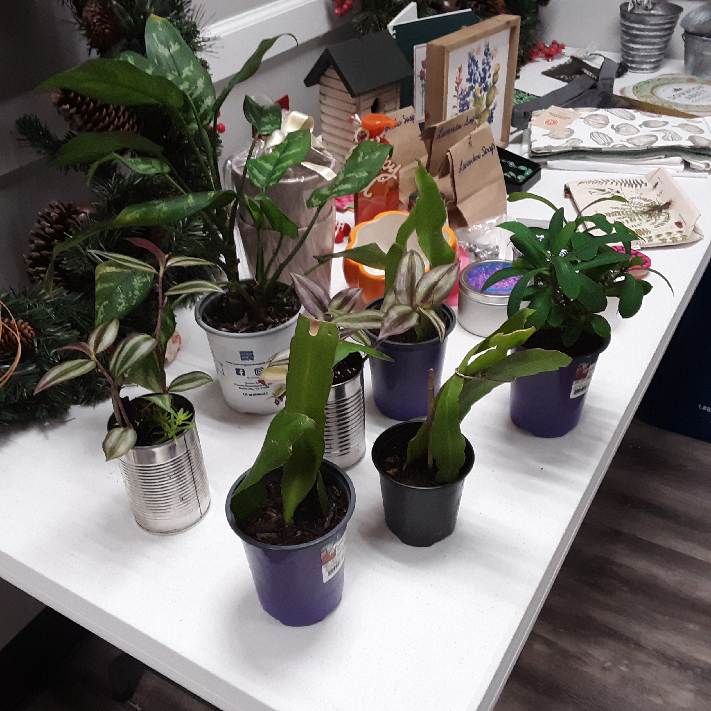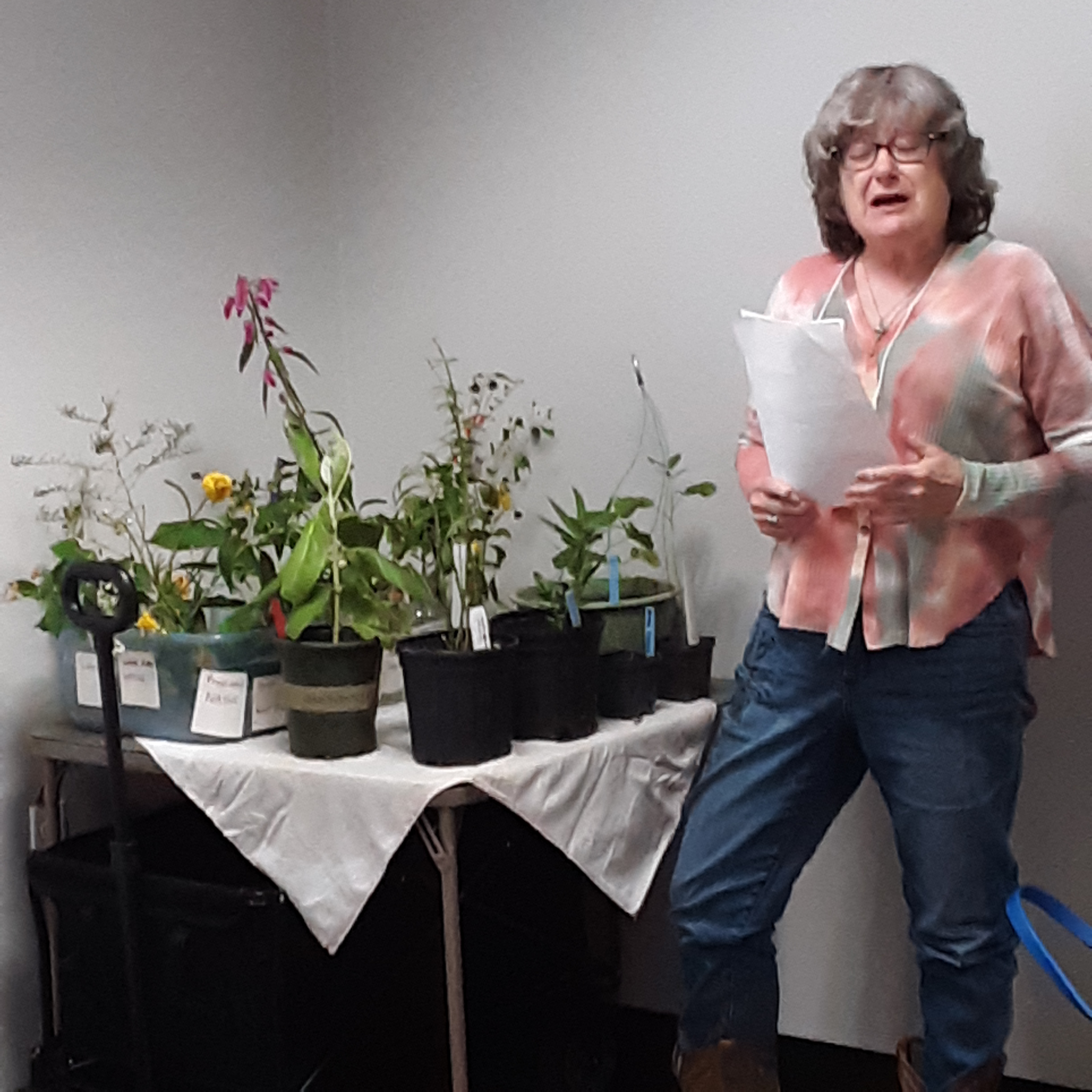 Plants on the Horticulture Table included versatile Tradescantia (groundcover, borders, containers), Queen of the Night, and Crown of Thorns. Judy Jones conducted the Monthly Drawing with many beautiful items.