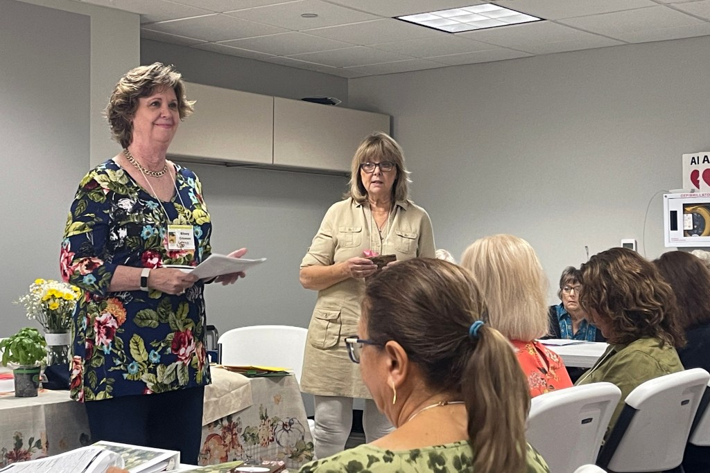 President Bitsey Crismon introduced the new meeting format, no more business (that’s taken care of at the board meetings) but more fun and sharing, and Sharon Podolski, Ways & Means Committee Chair, passed around the volunteer sign up sheet for the Fall Crafts & Plant Sale at The Woodlands Farmer’s Market at Grogan’s Mill on Saturday, October 15th.